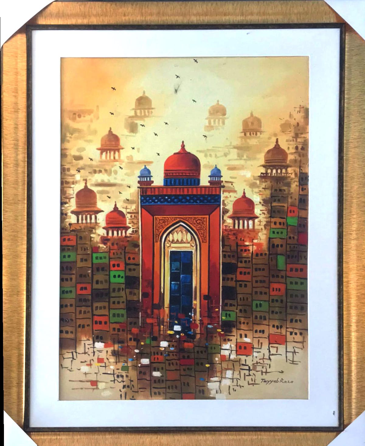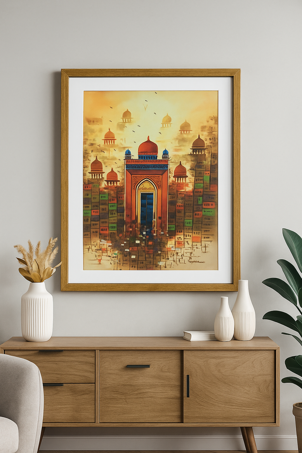 this piece depicts a city scene with a prominent red building featuring a blue door .This piece would make a stunning addition to any home or office, and would be a perfect gift for those who appreciate Islamic art and culture.