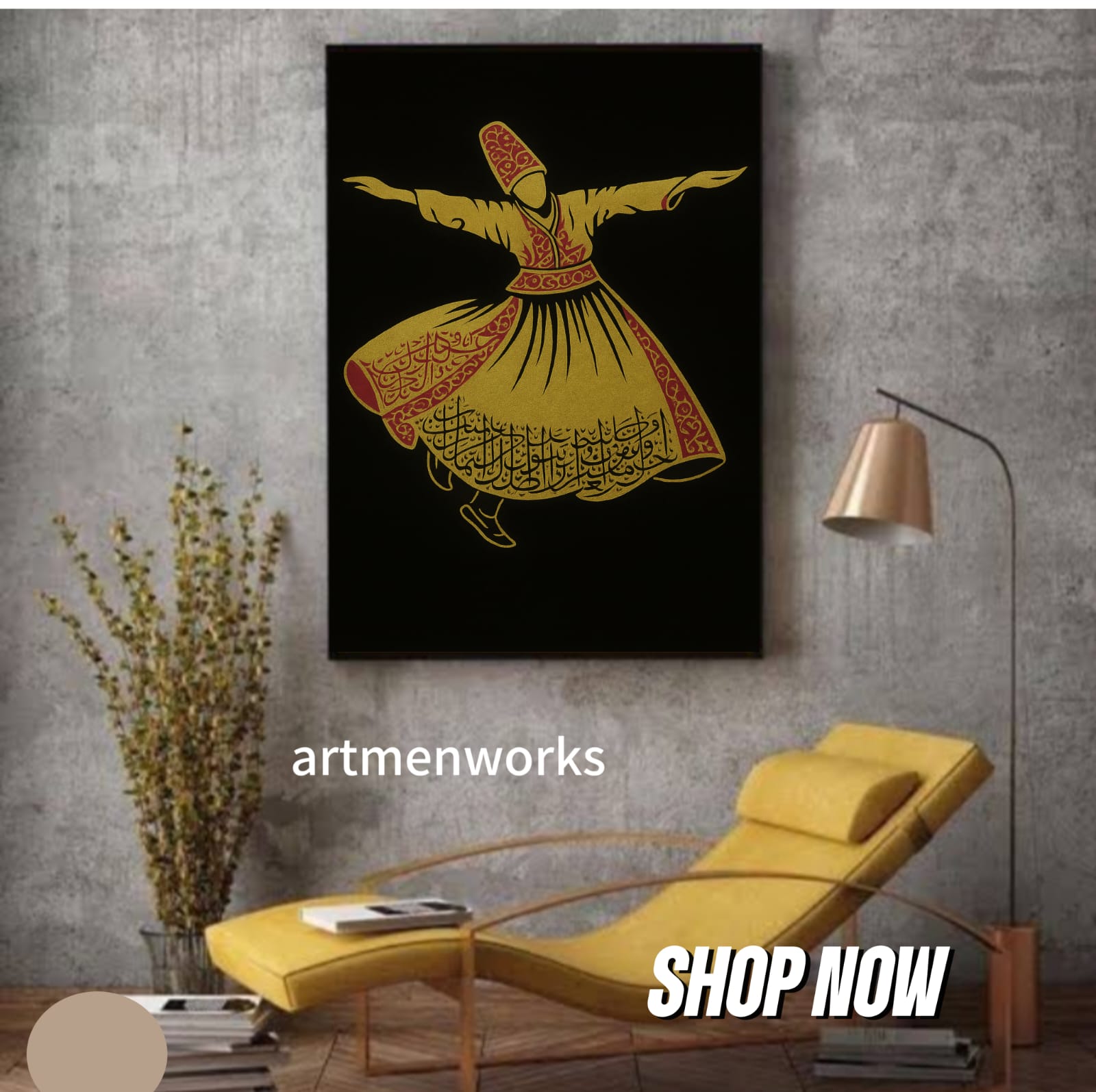 A handcrafted painting featuring a Whirling Dervish adorned with intricate Arabic calligraphy in radiant gold and red tones, set against a rich black background. A striking fusion of spiritual symbolism and fine Islamic art.